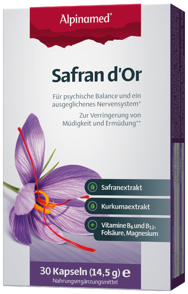 Alpinamed® Safran d’Or enthält in der Tagesdosis 30 mg Safranextrakt (5,6 % Crocine, 0,3 % Safranal) und 30 mg Curcumin aus Kurkumawurzelextrakt. Die Naturextrakte werden kombiniert mit einem Vitamin- und Mineralstoffkomplex aus den Vitaminen B6, B12 und Folsäure sowie Magnesium.