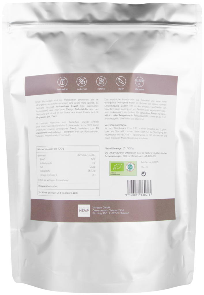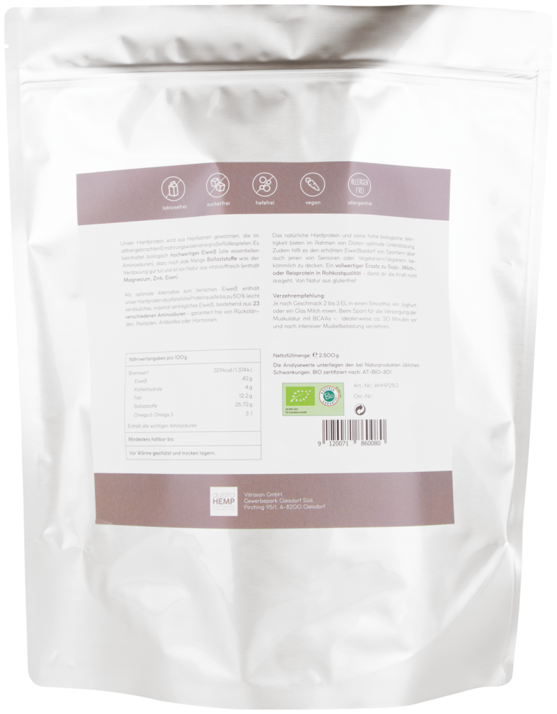 Für 1 kg Protein brauchen wir ca.10 kg pure Hanfsamen. Das Hanfprotein besteht aus biologisch hochwertigem Eiweiß (alle essentiellen Aminosäuren), essentiellen Mikronährstoffen (Eisen, Zink, Magnesium) und vielen Ballaststoffen, die der Verdauung und dem Stoffwechsel gut tun. Hanfprotein ist die optimale Alternative zu tierischem Eiweiß und enthält leicht verdauliches, maximal verträgliches Eiweiß, bestehend aus 23 verschiedenen Aminosäuren - garantiert frei von Pestiziden aber auch 100% frei von Antibiotika und Hormonen.