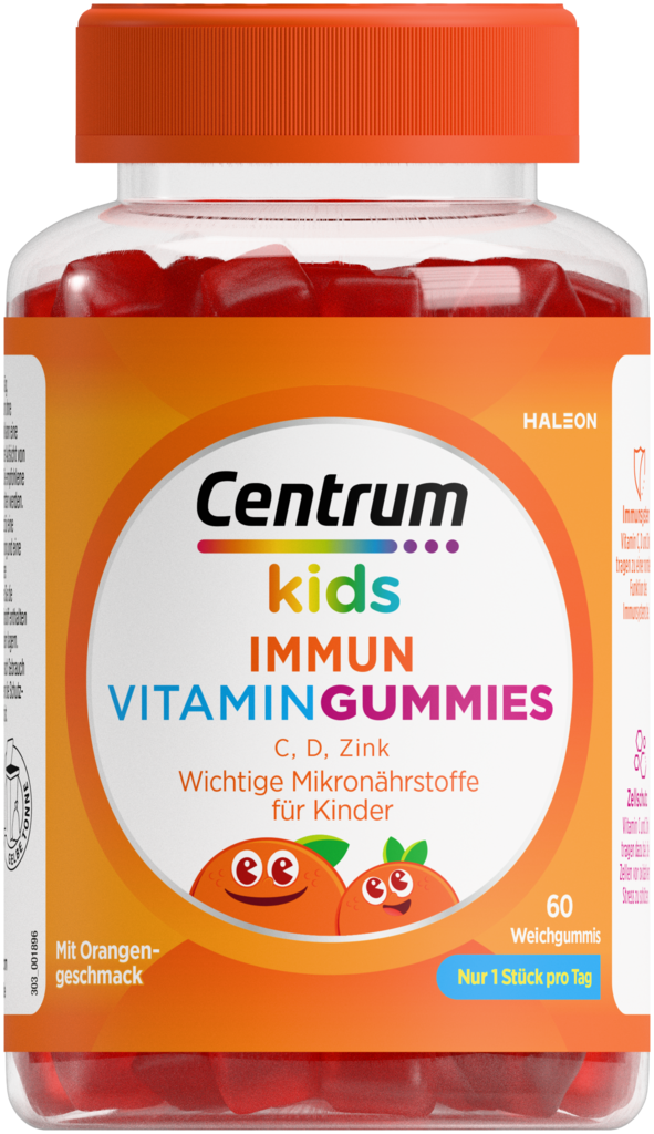 Genussvolle Unterstützung für das Immunsystem von Kindern ab 4 Jahren - angereichert mit Vitamin C, D und Zink, um die Abwehrkräfte zu stärken! Wenn Ihr Kind nicht gerade ein Fan von Obst und Gemüse ist, aber Sie dennoch nach einer Möglichkeit suchen, die Ernährung Ihres Kindes ausgewogen zu gestalten, sind die Vitamin Gummies von Centrum die ideale Lösung. Mit nur einem Gummi können Sie dazu beitragen, den täglichen Bedarf an Vitaminen und Mineralstoffen Ihres Kindes zu decken.