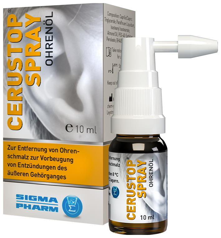 Cerustop® Ohrenöl Spray wird verwendet zur Entfernung von überschüssigem oder verhärtetem Ohrenschmalz (Cerumen) zur Vorbeugung von Entzündungen des äußeren Gehörganges sowie zur Reinigung der Ohrmuschel und des äußeren Gehörganges.