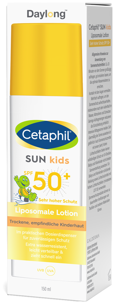 Kinderhaut ist besonders empfindlich gegenüber UV-Strahlung. Schon fünf Sonnenbrände während der Kindheit können das Hautkrebsrisiko um 70-80% erhöhen, die Folgen machen sich oft erst viele Jahre später bemerkbar. Cetaphil® steht für hochwertige dermatologische Pflege für jeden Hauttyp. Die Cetaphil Sun Kids Liposomale Lotion SPF 50+ ist speziell für die besonderen Ansprüche von empfindlicher Baby- und Kinderhaut entwickelt und pflegt mit Dexpanthenol und Glycerin. Zusätzlich sind beruhigende Aloe Vera und Vitamin E enthalten. Photostabile UV-Filter bieten hochwirksamen und sofortigen UVA- und UVB-Schutz , effektiven Zellschutz und beugen sonnenbedingter Hautalterung vor.