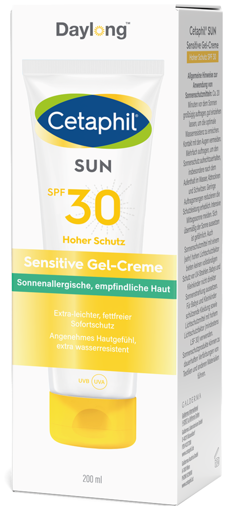 Die Cetaphil® Sun Daylong™ SPF 30 Sensitive Gel-Creme zieht schnell ein und sorgt dank der fettfreien Formulierung für ein angenehmes Hautgefühl. Die Wirksamkeit und Hautverträglichkeit wurden in einer Studie bei Anwendern mit Sonnenallergien nachgewiesen. Photostabile UV-Filter bieten hochwirksamen und sofortigen UVA- und UVB-Schutz , effektiven Zellschutz1 und beugen sonnenbedingter Hautalterung vor1. Cetaphil® Sun Daylong™ Sensitive Gel-Creme SPF 30 ist besonders geeignet für sonnenempfindliche, zu Sonnenallergie neigende sowie fettige Haut.