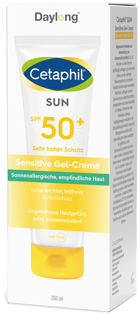 Die Cetaphil® Sun Daylong™ Sensitive Gel-Creme SPF 50+ zieht schnell ein und sorgt dank der fettfreien Formulierung für ein angenehmes Hautgefühl. Die Wirksamkeit und Hautverträglichkeit wurden in einer Studie bei Anwendern mit Sonnenallergien nachgewiesen. Photostabile UV-Filter bieten hochwirksamen und sofortigen UVA- und UVB-Schutz , effektiven Zellschutz1 und beugen sonnenbedingter Hautalterung vor1. Die Anwendung empfiehlt sich gerade auch bei sonnenüberempfindlicher und fettiger Haut. Cetaphil Sun Daylong Sensitive Gel SPF 50+ ist besonders geeignet für zu Sonnenallergie neigende sowie fettige Haut.