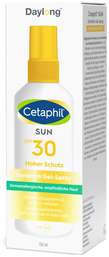 Cetaphil Sun Sensitive Gel-Spray SPF 30 ist besonders geeignet für zu Sonnenallergie neigende sowie fettige Haut. Es enthält weder Emulgatoren noch Fette, die in Kombination mit UVA-Strahlung die häufigsten Auslöser von Mallorca-Akne sind. Das leichte, fettfreie Gel-Spray lässt sich gut verteilen, zieht schnell ein und klebt nicht. Das Gel-Spray pflegt die Haut zusätzlich mit Vitamin E und sorgt für ein angenehmes Hautgefühl. Das leichte Gel-Spray SPF 30 ist gut geeignet für die Anwendung auf schwierig zu erreichenden oder behaarten Körperstellen.