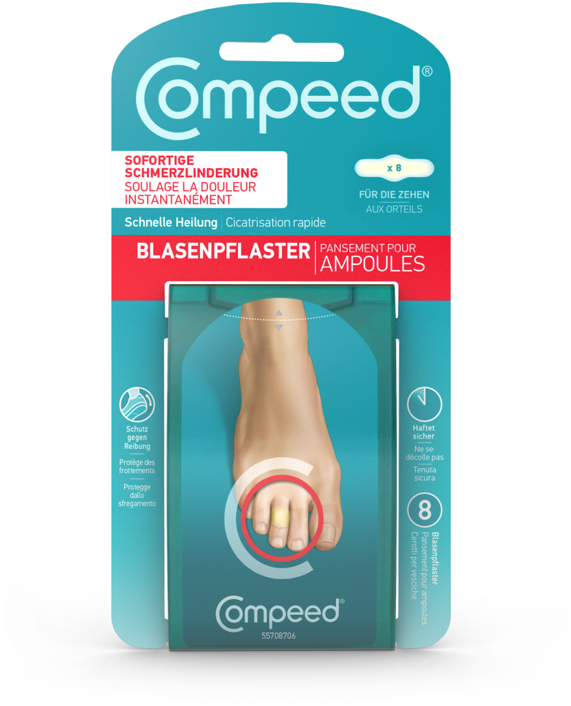 Das Compeed® Blasenpflaster für die Zehen weist Wasser, Schmutz und Bakterien ab und beschleunigt durch das Prinzip der feuchten Wundheilung den Heilungsprozess deutlich. Egal ob Laufschuhe, Sandalen oder Pumps – Blasen an den Zehen sind mit diesem Blasenpflaster kein Thema mehr!