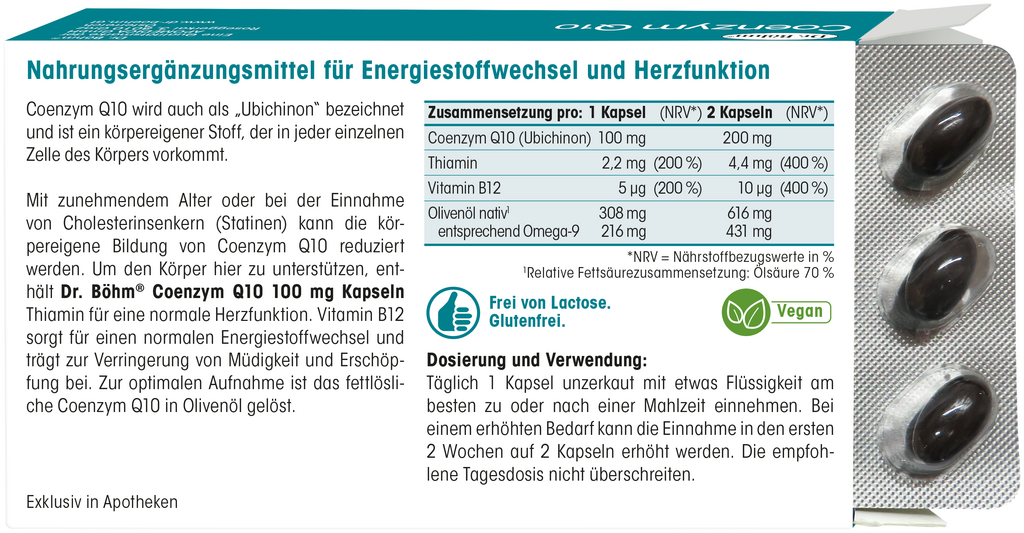 Dr. Böhm Coenzym Q10 Kapseln enthalten den körpereignen Stoff Coenzym Q10 (Ubichinon) sowie die wichtigen Vitamine Thiamin und Vitamin B12 für eine gesunde Herzfunktion und zur Verringerung von Müdigkeit und Erschöpfung.