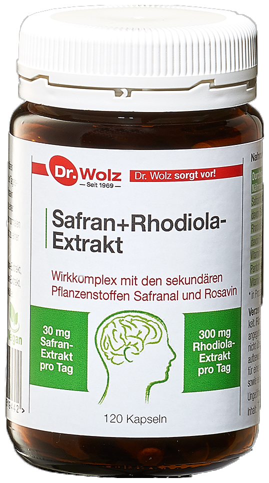 afran, Rhodiola und Vitamine und werden traditionell schon seit Jahrhunderten eingesetzt. Der Safran+Rhodiola-Extrakt kombiniert die wertvollen Stoffe in hoher Qualität. Safran+Rhodiola-Extrakt Dr. Wolz unterstützt in Kombination mit B-Vitaminen die Gesundheit von Psyche und Geist und hilft bei Müdigkeit, Erschöpfung sowie geistigem Leistungsabfall.