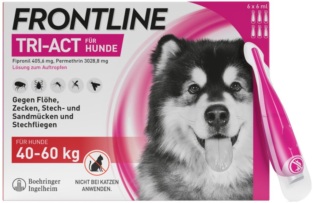 FRONTLINE TRI-ACT® - der innovative Parasitenschutz schützt Hunde gegen Zecken, Flöhe und fliegende Parasiten (Stechmücken, Sandmücken und Stechfliegen) schon vor dem Stich durch seine abwehrende Wirkung. So wird das Risiko der Übertragung gefährlicher Krankheiten reduziert.