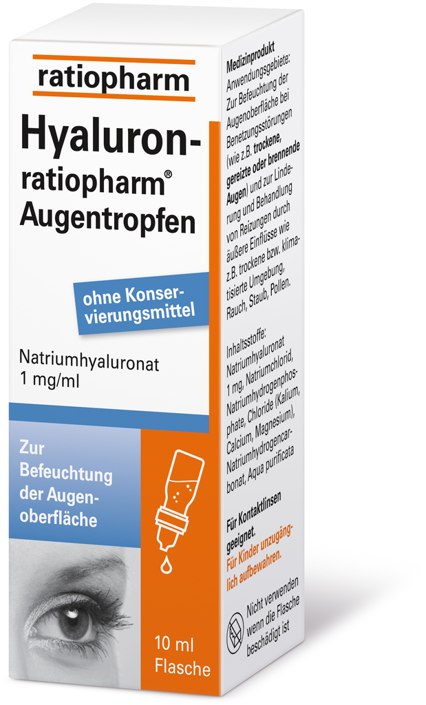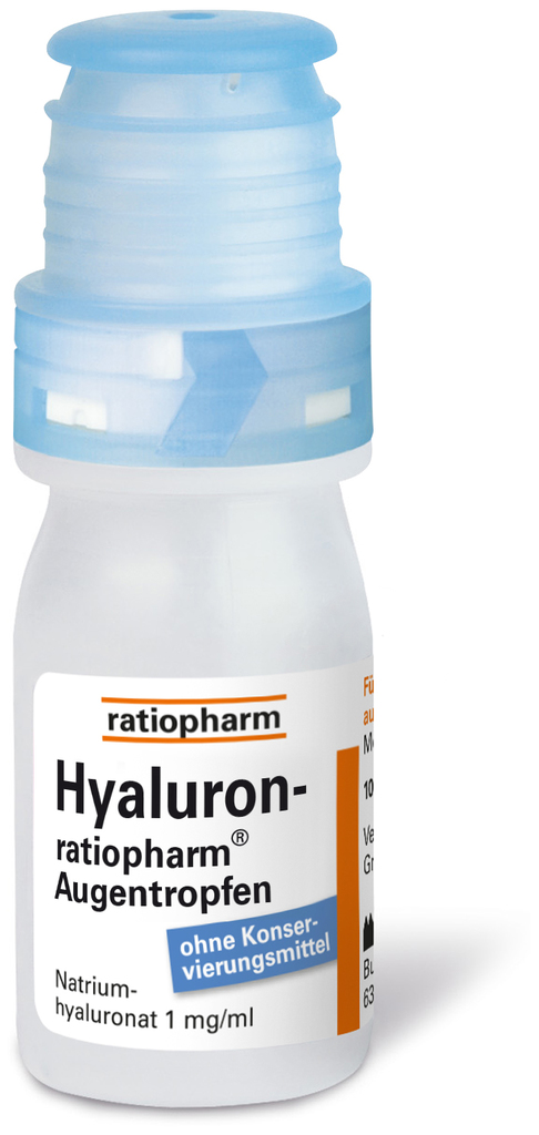 Hyaluron-ratiopharm® Augentropfen sind ein Medizinprodukt zur Befeuchtung bei trockenen, gereizten oder brennenden Augen und sind ab sofort auch als GEL Augentropfen erhältlich für eine intensive Befeuchtung der Augenoberfläche. Hyaluron-ratiopharm® Augentropfen und Hyaluron-ratiopharm GEL Augentropfen. Sie sind der natürlichen Tränenflüssigkeit nachempfunden (künstliche Tränen) und verschaffen ein wohltuendes, erfrischendes Gefühl im Auge. Ein Tropfen genügt, um das normale Tränenvolumen wiederherzustellen. Je nach Bedarf können die Tropfen auch mehrmals täglich angewendet werden.