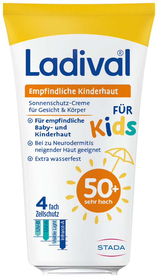Die Ladival®-Serie Empfindliche Kinderhaut ist speziell auf die Bedürfnisse von zarter Baby- und Kinderhaut abgestimmt. Die reichhaltige Öl-in-Wasser-Emulsion spendet Feuchtigkeit und pflegt mit Dexpanthenol, ohne dabei zu kleben. Sie eignet sich für Baby- und Kinderhaut ab 6 Monaten sowie bei Neigung zu Neurodermitis. In den Augen verursacht sie kein Brennen. Die Ladival® Kinder Sonnencreme ist extra wasserfest, hat einen sehr hohen Lichtschutzfaktor (50+) und ist korallenfreundlich. Dank der kompakten, nachhaltigen 50 ml Tube wird sie zum idealen Begleiter für den nächsten Urlaub mit der Familie.