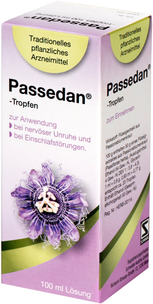 100 g enthalten 50 g eines Flüssigextraktes aus Passionsblumenkraut (Passiflorae herba), (Auszugsmittel: Ethanol 54 Gew.-%, Glycerin 4 Gew.-% DEV 1:3,8-4,3)