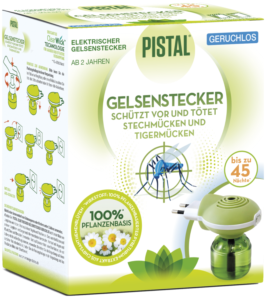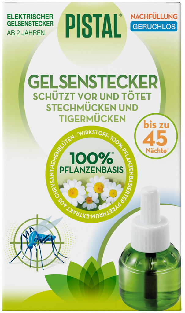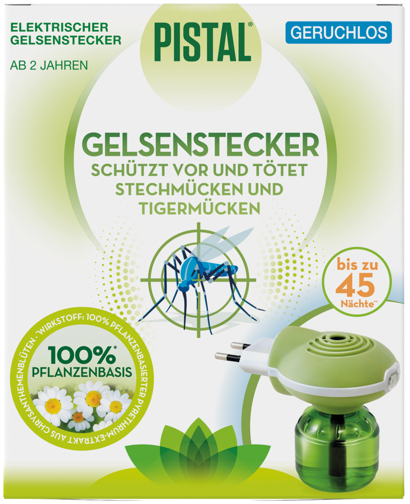 Pistal® Gelsenstecker ist der 1. elektrische Gelsenstecker auf pflanzlicher Basis (Pyrethrum-Extrakt aus der Chrysantheme).