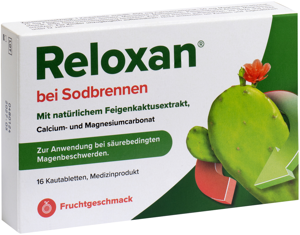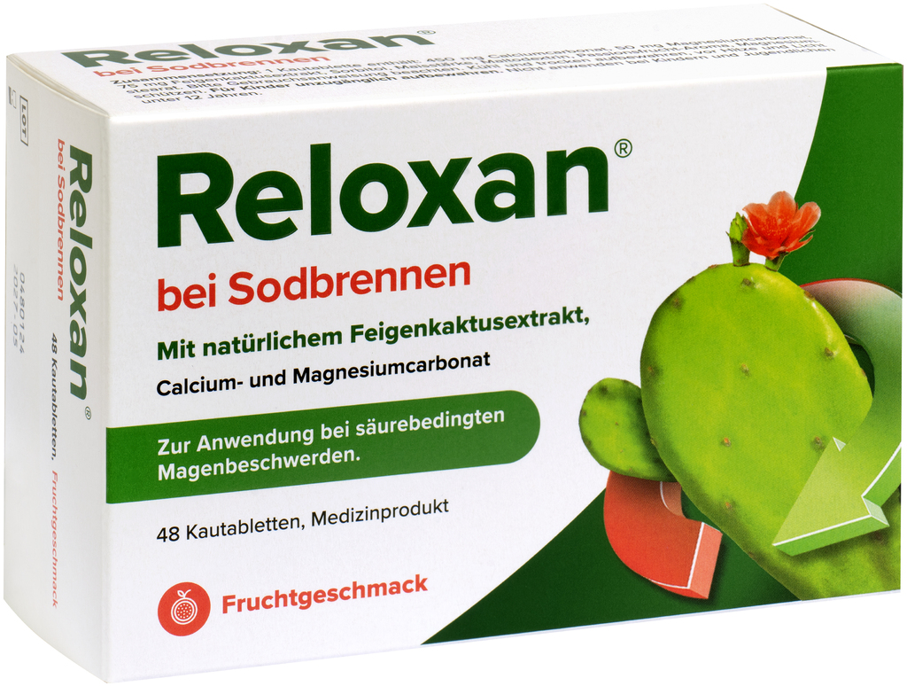 Sodbrennen, saures Aufstoßen oder anhaltender Druck im Magen sind häufige Beschwerden und ziemlich lästig. Sie kennen das und wünschen sich eine rasche und gleichzeitig verträgliche Linderung? Dann kann Reloxan® helfen. Denn die neuen Reloxan® Kautabletten wirken gleich zweifach bei Sodbrennen: Sie sorgen durch mineralische Säurepuffer für eine schnelle und anhaltende Linderung von säurebedingten Magenbeschwerden. Ihre einzigartige Kombination mit hochkonzentriertem, pflanzlichem Feigenkaktusextrakt bietet außerdem natürlichen Schutz für die angegriffene Schleimhaut der Speiseröhre.