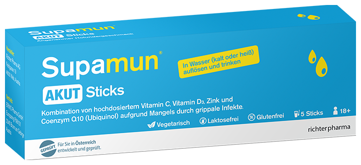 Supamun AKUT Sticks ist ein Lebensmittel für besondere medizinische Zwecke (Bilanzierte Diäten). Zum Diätmanagement bei grippalen Infekten.