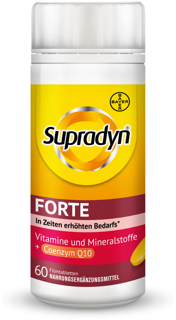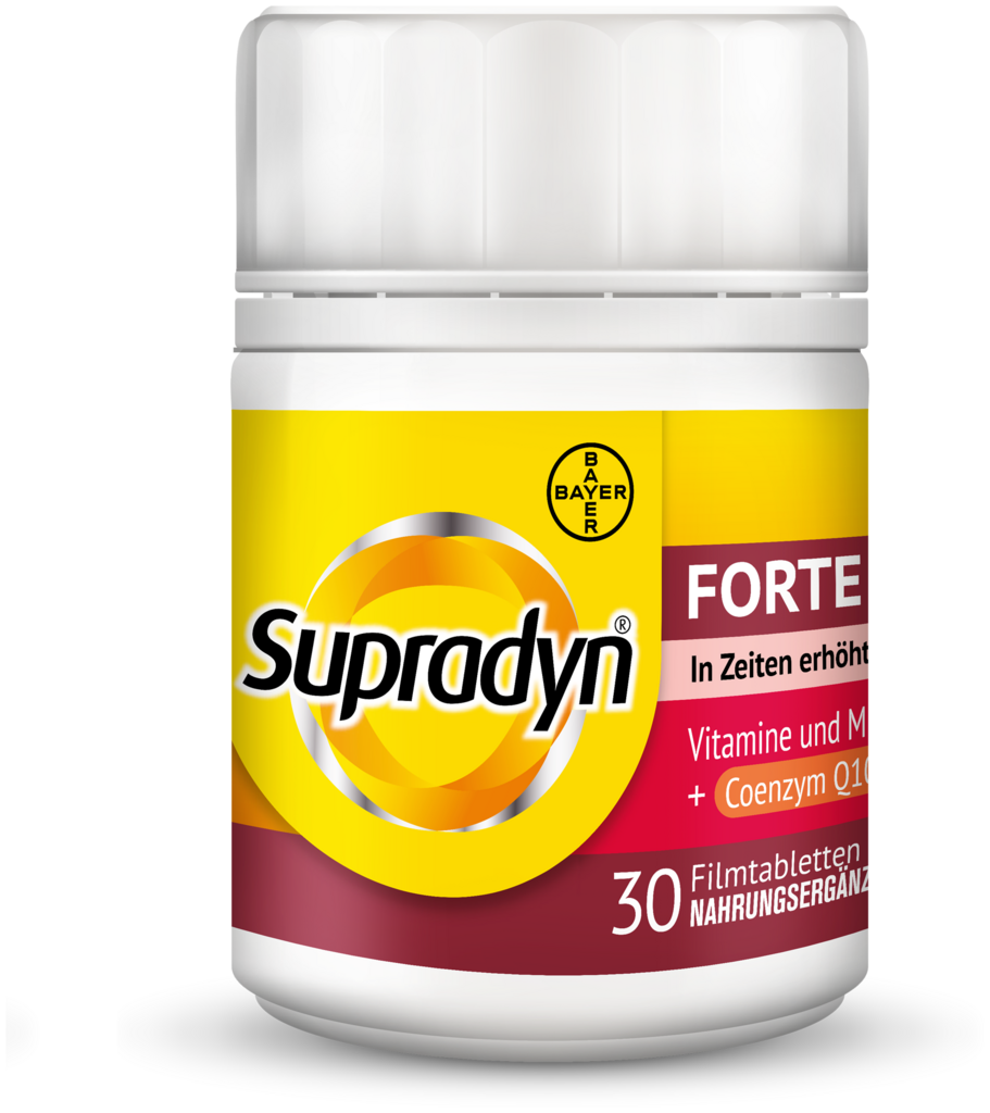Supradyn® FORTE ist ein Multivitamin mit allen 13 Vitaminen, 9 Mineralstoffen sowie Coenzym Q10. Es versorgt durch seine erhöhte Dosierung den Körper gezielt mit vielen Mikronährstoffen, die er in anspruchsvollen Zeiten besonders benötigt.