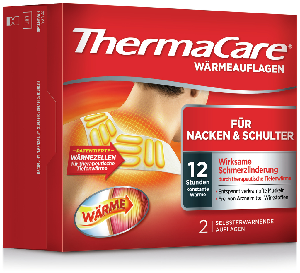 ThermaCare Wärmeumschläge und -auflagen erzeugen mindestens 8 Stunden lang wohltuende, therapeutische Tiefenwärme, entspannen so die Muskulatur und lindern Schmerzen effektiv.