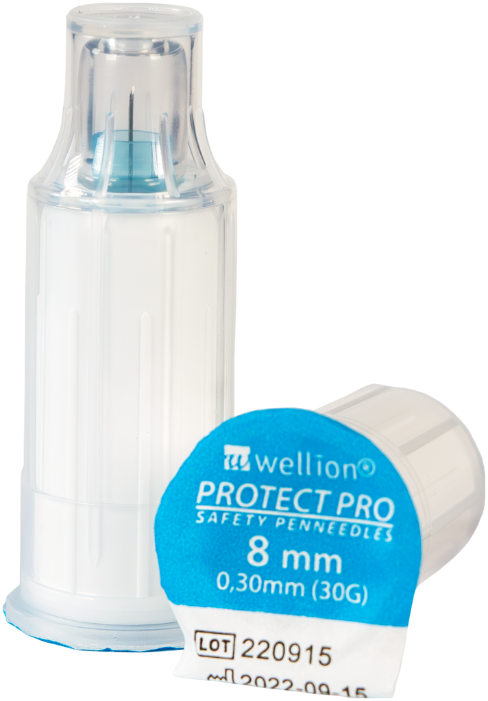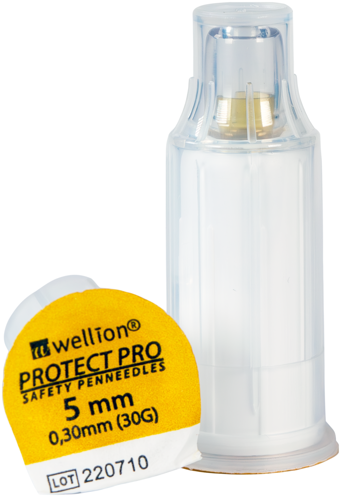 - VOR der Insulininjektion: Bei einer unbenutzten Wellion PROTECT PRO Sicherheitspennadel ist die farbige Kappe noch sichtbar. Die Injektion muss in einem Winkel von 90° in die Haut erfolgen (eventuell Haut spannen).